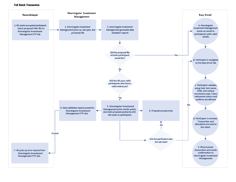 Easy Enroll is a mini enrollment journey built adjacent to Morningstar® Retirement ManagerSM (RM5). There are three supported transaction options for enrollments originating from site. All options relate to batch transactions.